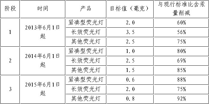 第一阶段:2013年6月1日起,紧凑型荧光灯、长效荧光灯、其他荧光灯含汞量的目标值分别为2.0毫克、3.5毫克、2.5毫克。