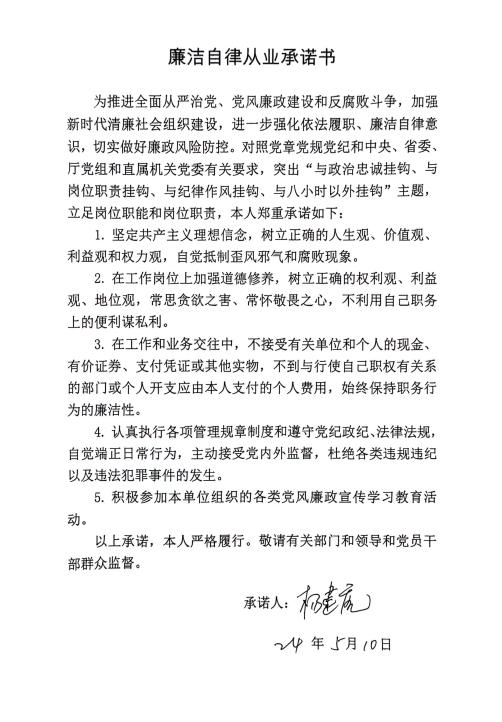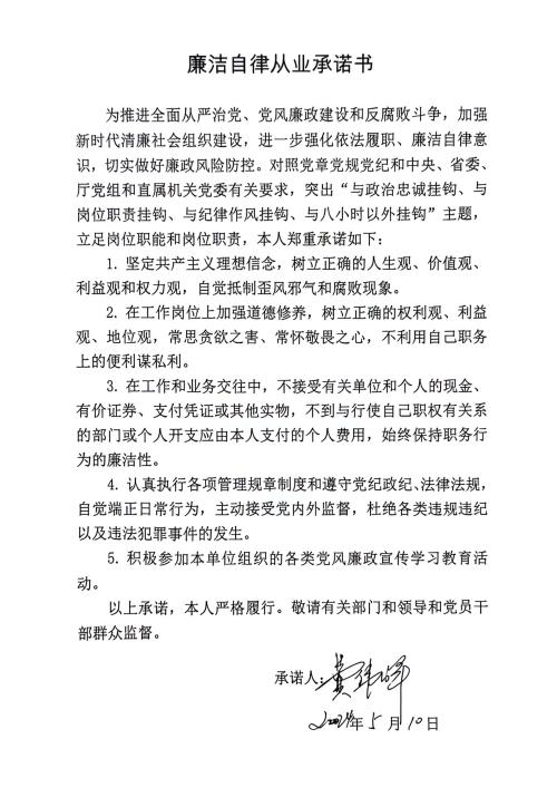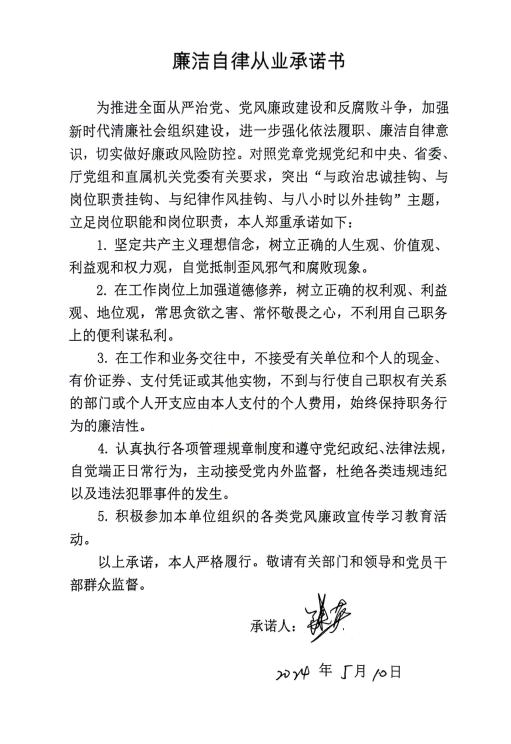 开展廉洁自律承诺活动。全体党员佩戴党徽,签订廉洁自律承诺书,不忘初心和使命,增强自我约束意识,筑牢拒腐防变的思想防线。