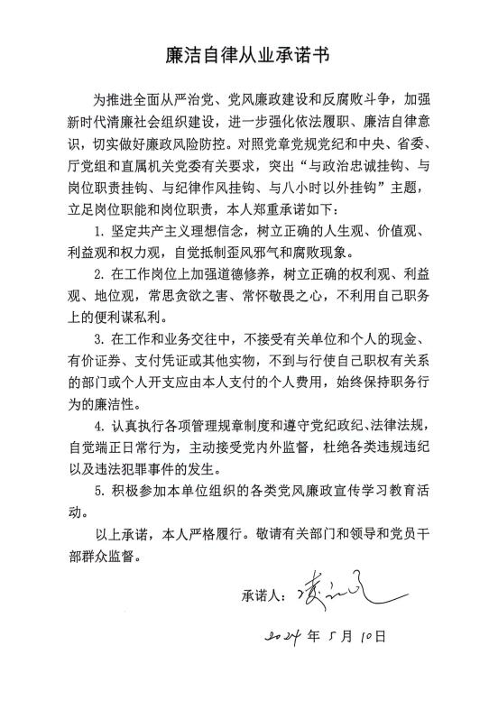时间:2024.5.10 地点:会议室主持人: 凌应明参加人员:凌应明 陈刚 陈英 费伟峰 杨建虎会议内容:开展廉洁自律承诺活动。全体