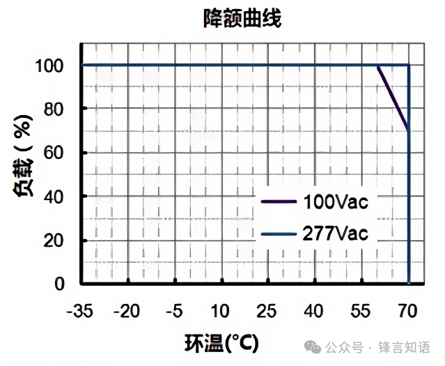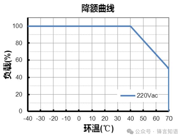 以这款350W 24V防雨电源为例,其工作环境温度范围为-40℃至70℃。当环境温度超过40℃时,电源开始降额运行,到60℃时功率下降65%(即相当于227.5W)。若打8折配置,最多仅能带动182W的灯具。