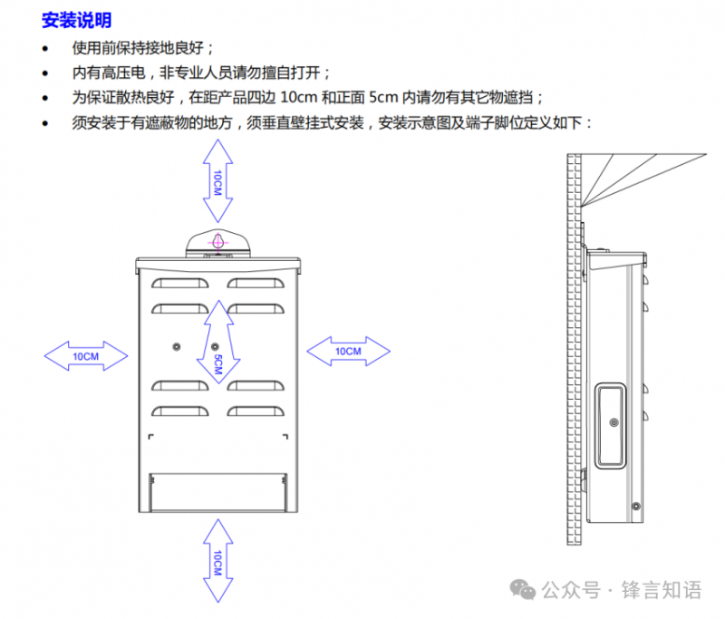 2.户外裸露安装:应在半户外或者上方有遮挡物的情况下,竖直安装(勿平放),输出端朝下。