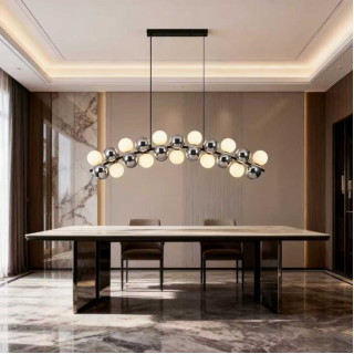 代马灯饰自主设计的专利匠心之作——北欧魔法豆吊灯68120系列吊灯,以独特的球型组合呈现出极具现代感的视觉效果。铬色玻璃球与奶白玻璃球巧妙搭配,铬色玻璃作为装饰,折射出精致光泽,奶白玻璃球则负责发光,营造出柔和温馨的氛围。它采用 G9 光源,更换简单便捷,为空间带来时尚与实用兼具的照明体验,无论是客厅还是餐厅,都能成为空间中的亮眼焦点。
