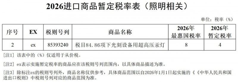 二、维持对光刻设备用超高压汞灯的进口暂定税率自2026年1月1日起,“税目84.86项下光刻设备用超高压汞灯”继续实施进口暂定税率。该税率同2025年一致。
